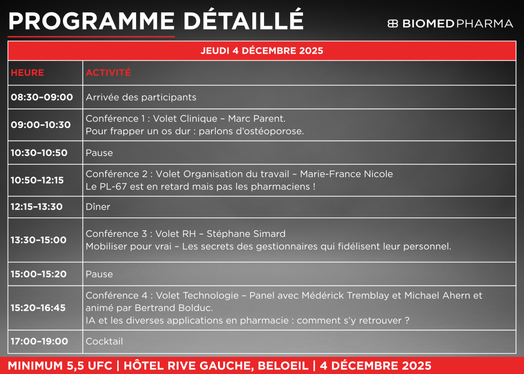 On vous donne rendez-vous à l’hôtel Rive Gauche, à Beloeil, pour une journée de conférences, de formations et d’échanges autour de l’officine.
